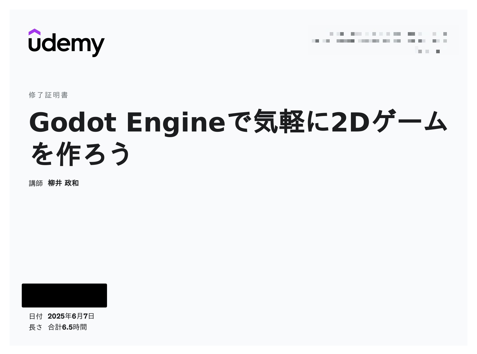 私はそれに加えて、YouTubeやUdemyなどの動画チュートリアルを複数個完了させることで基礎を固めています。今回はUdemyにて「Godot Engineで気軽に2Dゲームを作ろう」という基礎に最適なコースを見つけました。これを6.5時間ほどかけて修了しました。