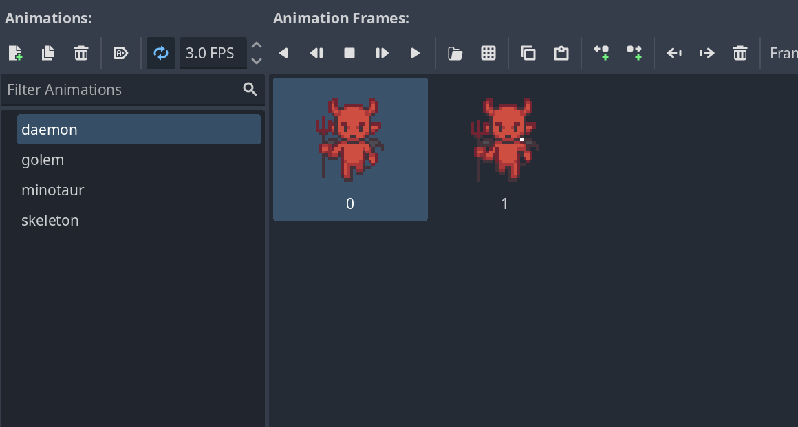 - AnimatedSprite2Dのスプライトシート制作が快適: Unityではスライス→個別設定が必要だが、Godotはグリッドアイコンから必要な画像を選ぶだけで即座にタイムラインに並ぶ。