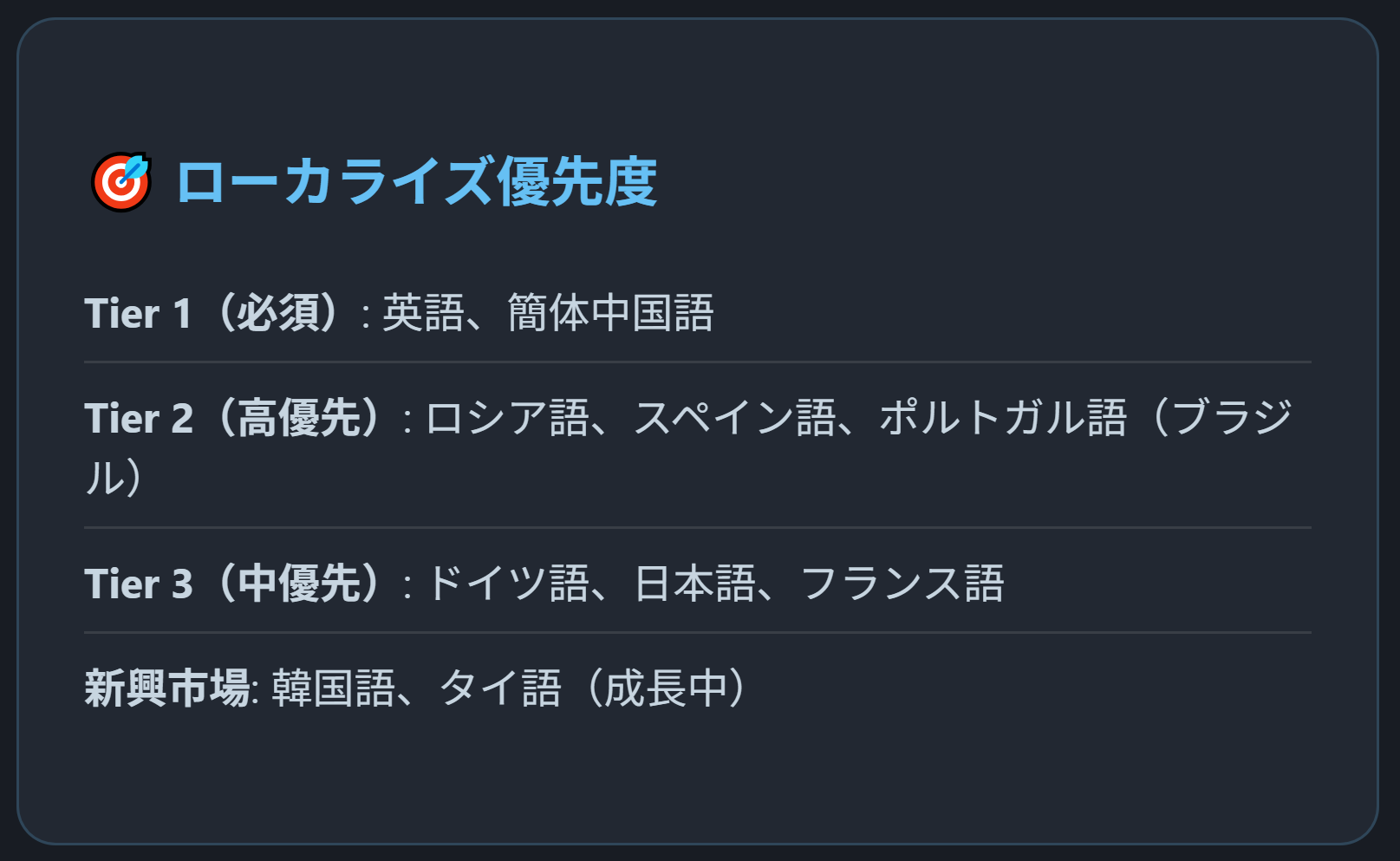 日本の個人開発者がローカライズを進める場合、下記のような段階的アプローチが現実的でしょう。
