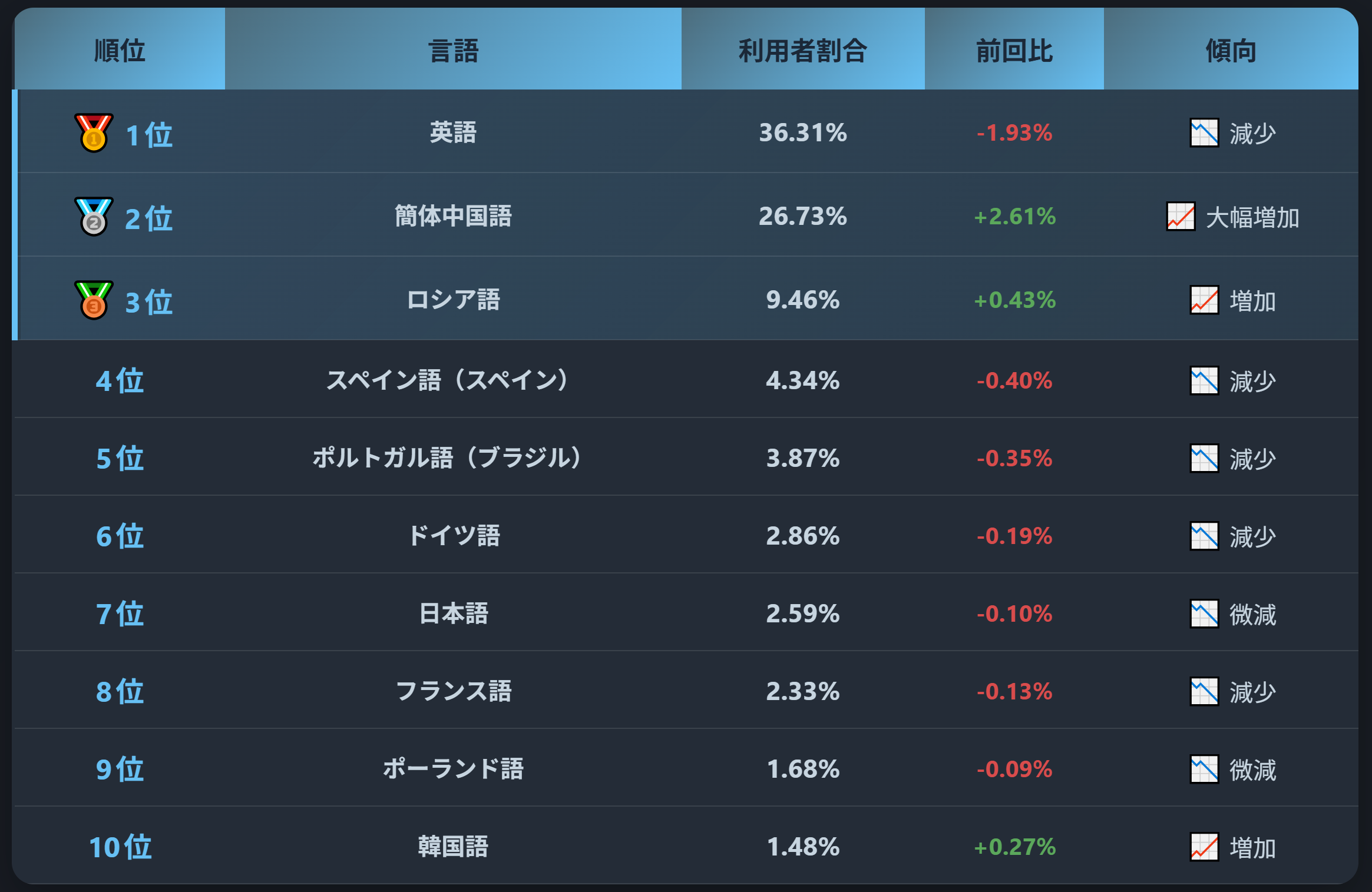 | 7位 | 日本語 | 2.59% | -0.10% | 📉 微減 |