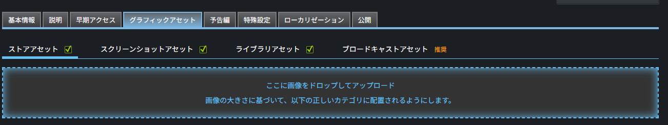 しかも、これらの画像は厳格にサイズが決められています。例えば、ヘッダーカプセルは920×430px、小型カプセルは462×174pxです。完璧に同じサイズでなければなりません。SteamWorksでは、ドロップされた画像のサイズに基づいて各画像が設定されるため、少しでもサイズが違うと拒絶されます。