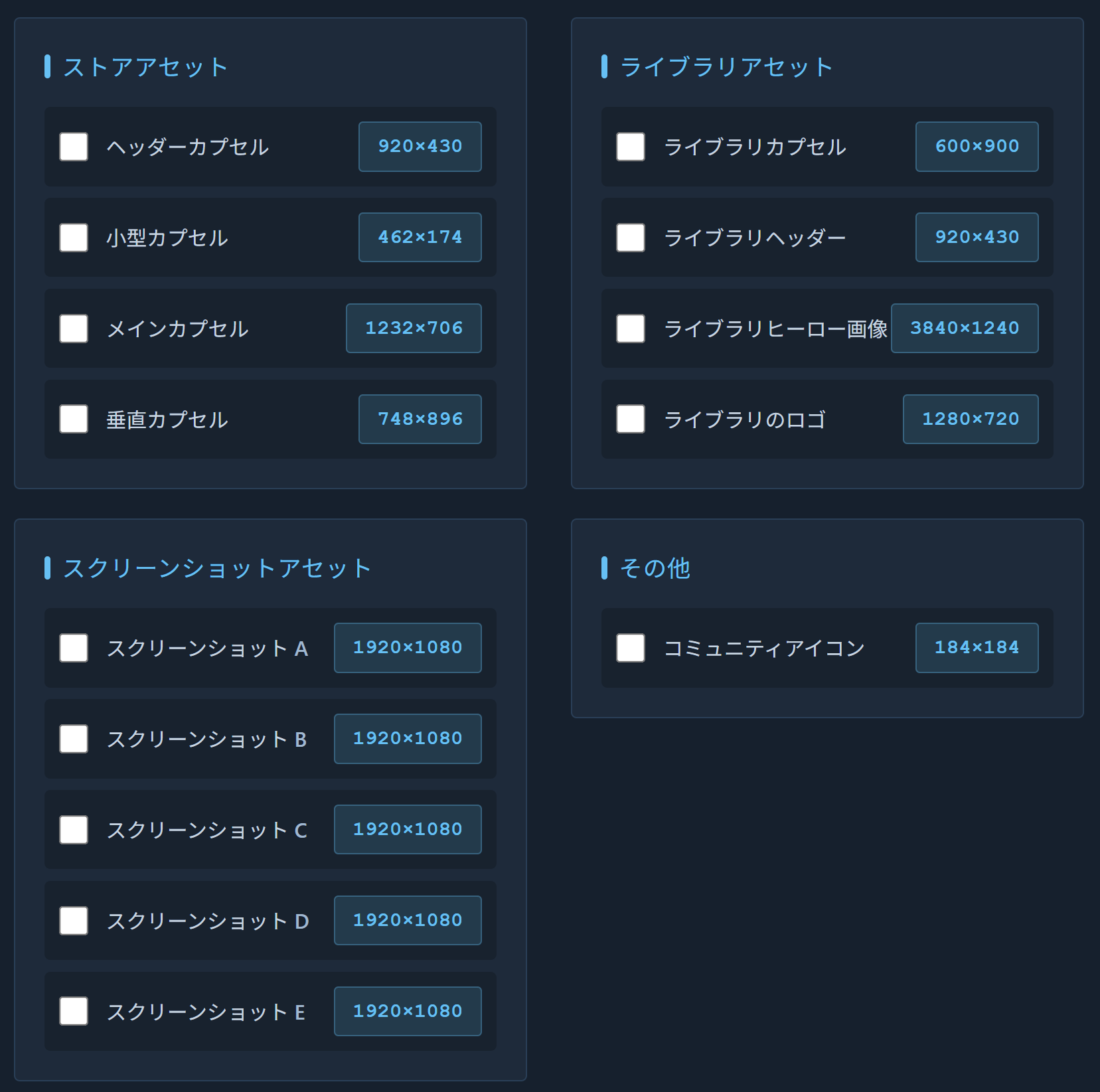 Steamのストア情報に必要なグラフィックアセットは、「ストアアセット」「スクリーンショットアセット」「ライブラリアセット」の3種類です。下記のチェックリストを参考に制作しましょう。