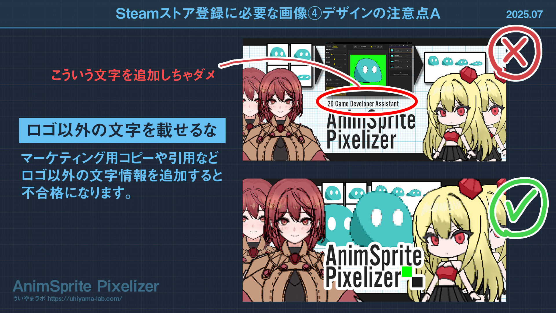 Steamサポートチームはかなり具体的に修正内容を通知してくれるので助かりました。画像サイズについて説明する記事はいくつもありますが、NGデザインについてはほぼ情報がなかったので、参考にしていただけると幸いです。