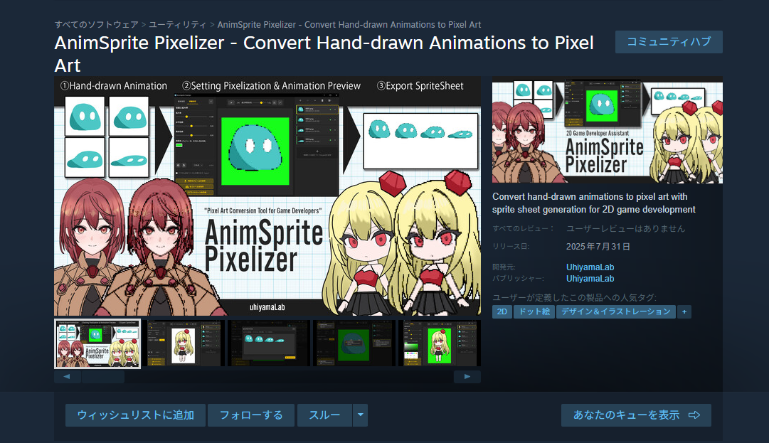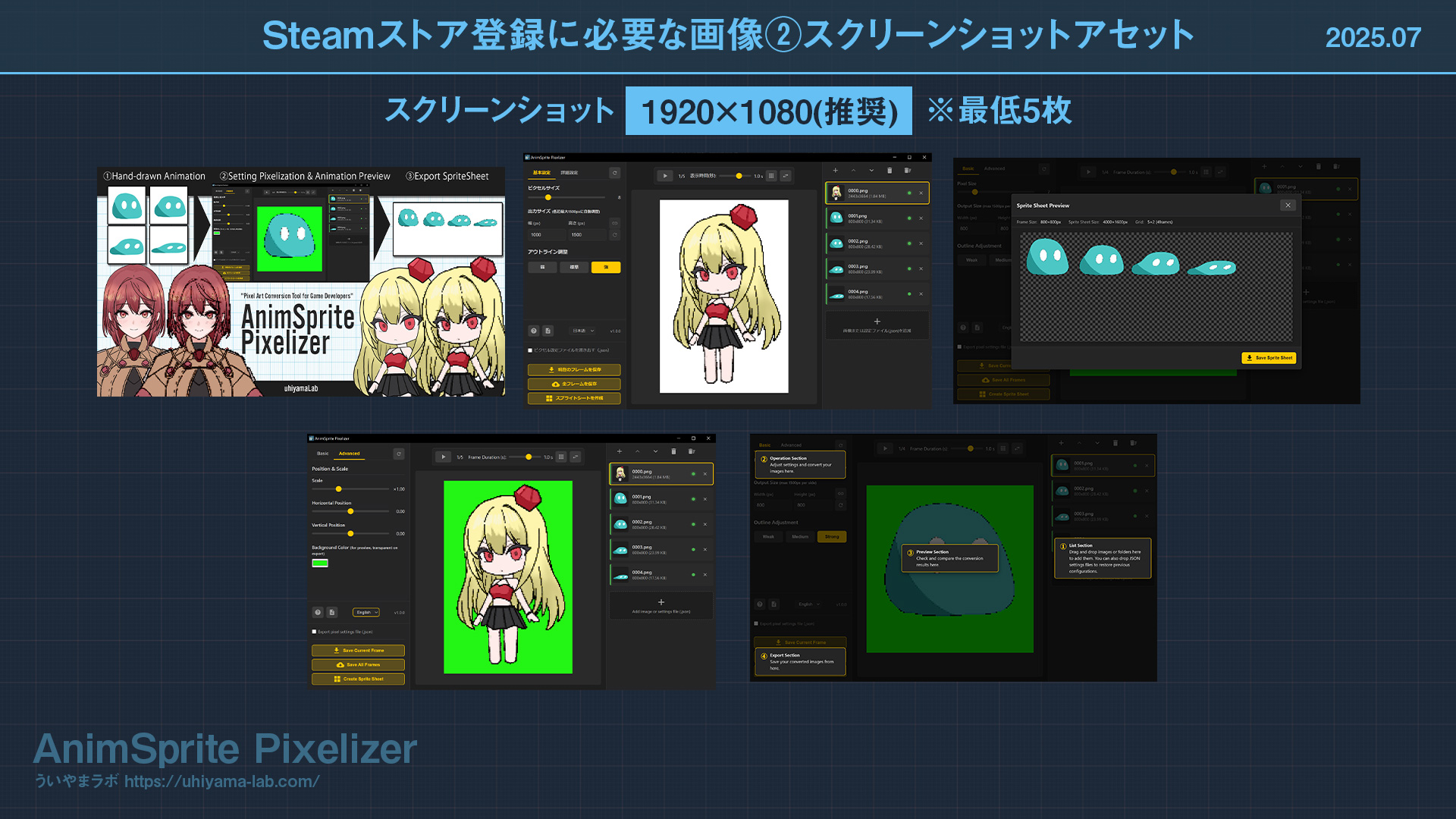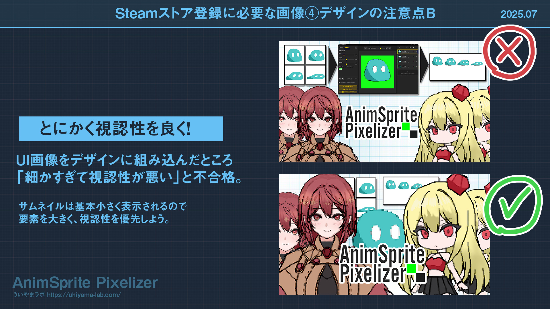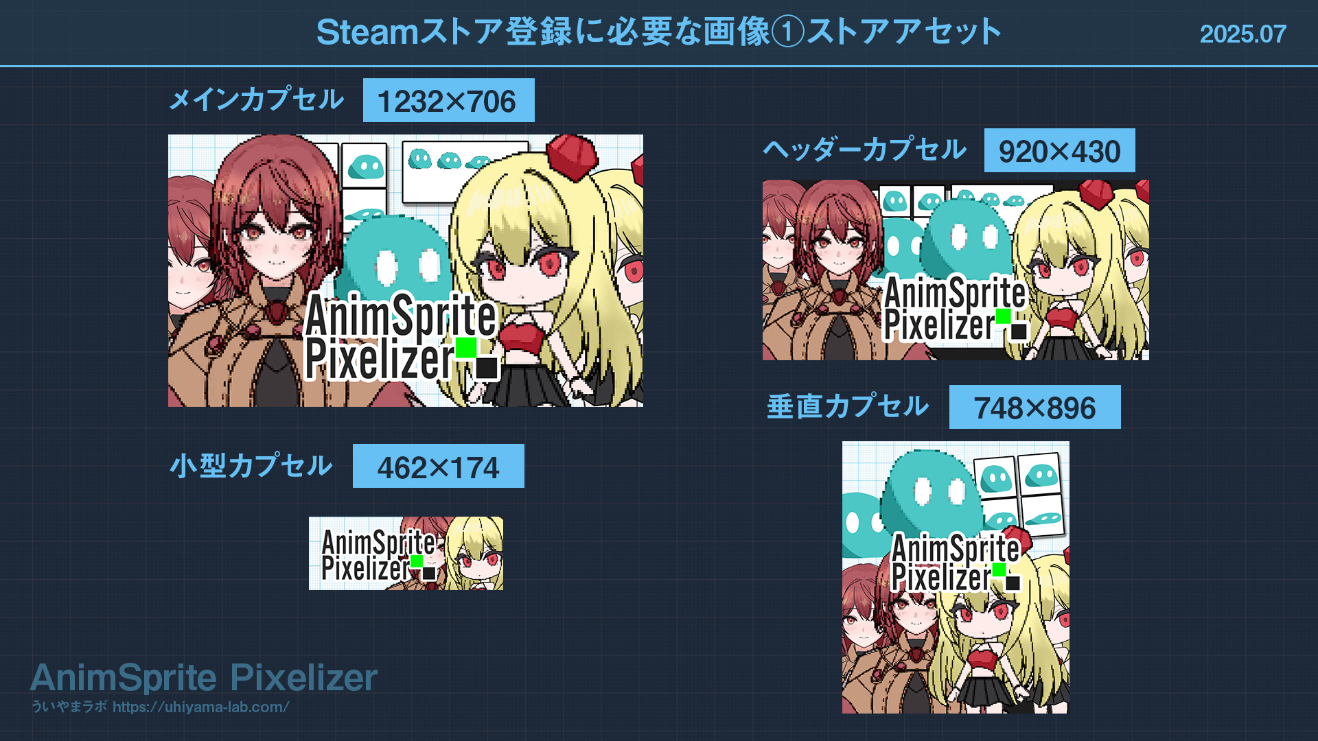 AnimSprite Pixelizerの場合、アプリ本体の審査は一発で合格しましたが、商品画像について何度か訂正を求められました。今回は、Steam販売に必要な14枚の画像とデザインの注意点についてまとめます。