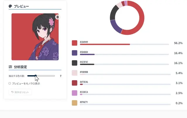 右側に色の構成比を示した円グラフとカラーリストが表示されます。左側のパネルで「抽出する色の数」をスライダーで調整できます。
