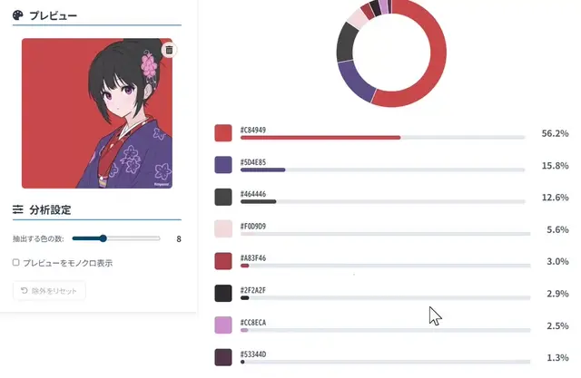 イラスト画像をアップロードすると、使われている色の種類とその構成比率を円グラフとリストで表示するツールです。