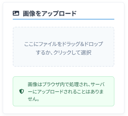 このツールは、プライバシーを最優 先に設計しています。画像の選択から分析、結果の表示まで、すべての処理がブラウザ内部で完結します。