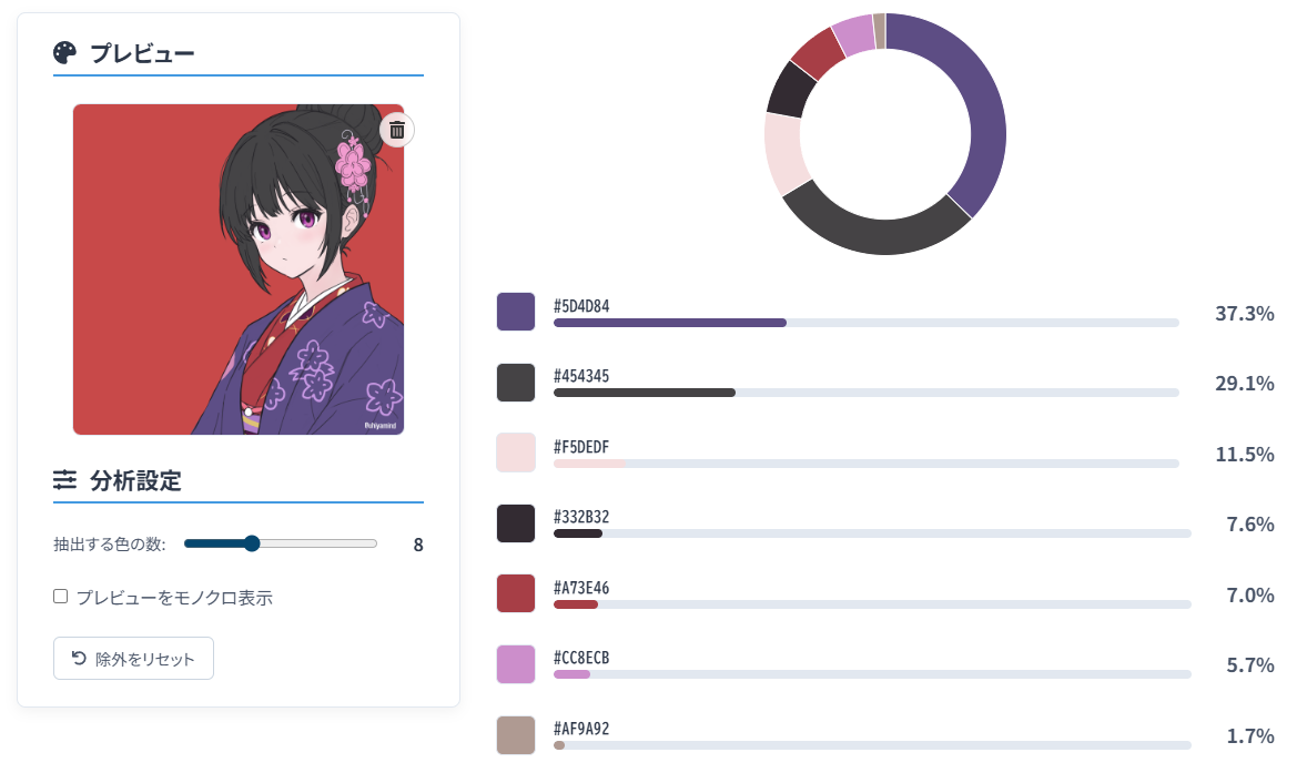 右側に色の構成比を示した円グラフとカラーリストが表示されます。左側のパネルで「抽出する色の数」をスライダーで調整できます。