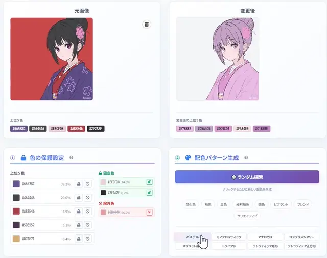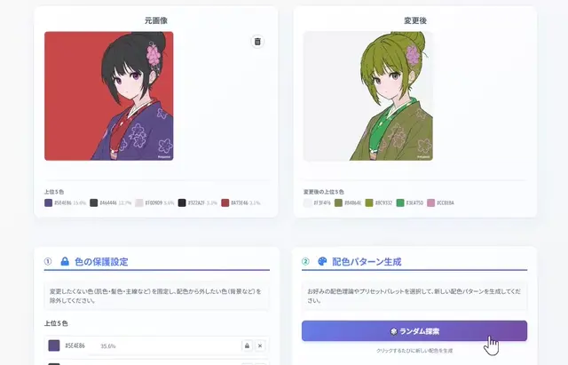 イラストをアップロードして、ワンクリックで配色パターンを生成できるブラウザツールです。最大の特徴は、変更したくない色(肌、主線など)を固定して、不要な色(背景など)を除外できる点です。