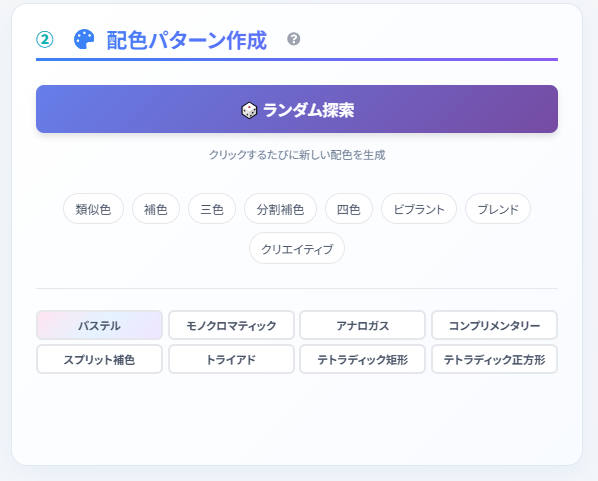 - ランダム探索、色彩理論、パステル調など、多彩な配色生成モード