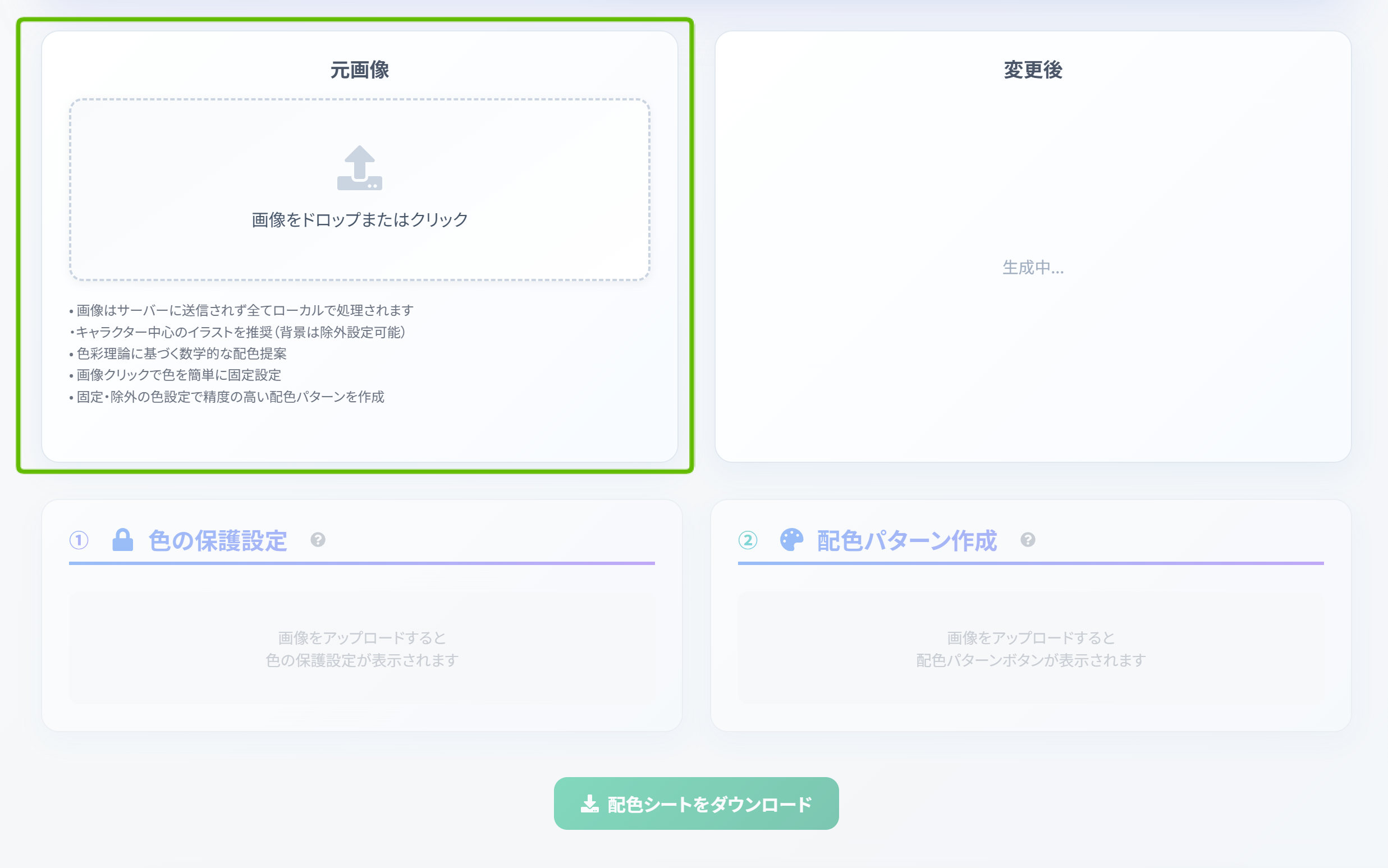 このツールは、プライバシーを最優先に設計しています。画像のアップロードから色彩分析、配色の生成、画像のダウンロードまで、すべての処理がブラウザ内で完結します。