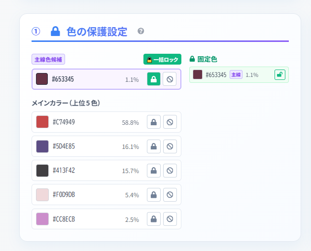 画像が分析されたら、変更したくない色を設定します。元画像をクリックして、その部分の色を直接「固定」するのが直感的でおすすめ。
