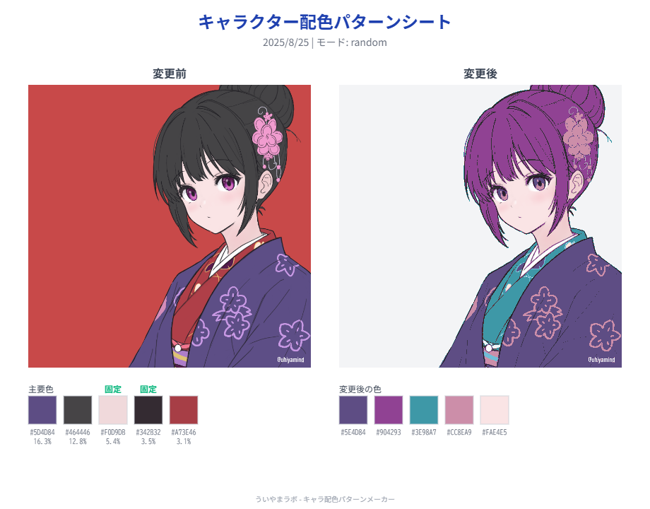 これで、キャラの肌や髪の色はそのままに、服や小物の配色だけを変更できます。色彩理論に基づいたパターンや、ランダムで思いもよらない組み合わせも試せます。