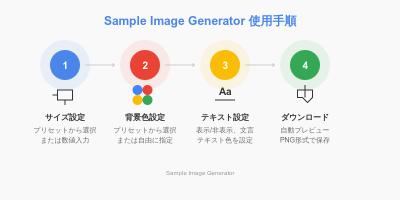 サイズ・背景色・テキストを指定するだけで、即座にPNG画像をダウンロードできます。
