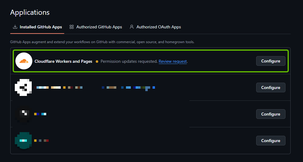 - 「Installed GitHub Apps」タブを選択し、リストの中から「Cloudflare Pages」(または類似の名前)を見つけてクリックします。