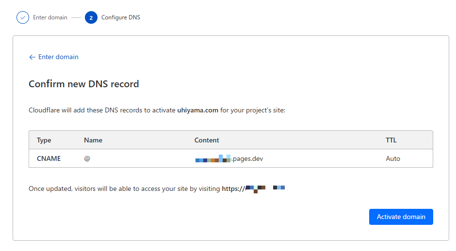 今度 はCloudflareがドメインを認識しているため、「ドメインをアクティベート」や「DNSレコードを確認」といった画面が表示されるはずです。Cloudflare Pagesが必要とするDNSレコード(通常はCNAMEレコード)が自動で設定(または提案)されます。内容を確認し、「ドメインをアクティベート」ボタンをクリックします。