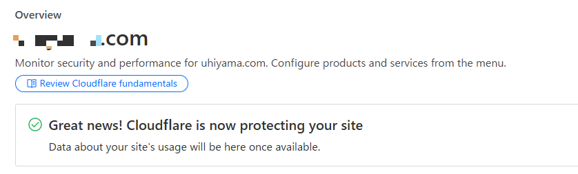 ネームサーバーの変更がCloudflare側で無事に認識されると、Cloudflareダッシュボードのドメイン管理画面で、該当ドメインのステータスが「保留中」から「アクティブ」に変わります。(今回は比較的早く、5分程度で反映されました)。