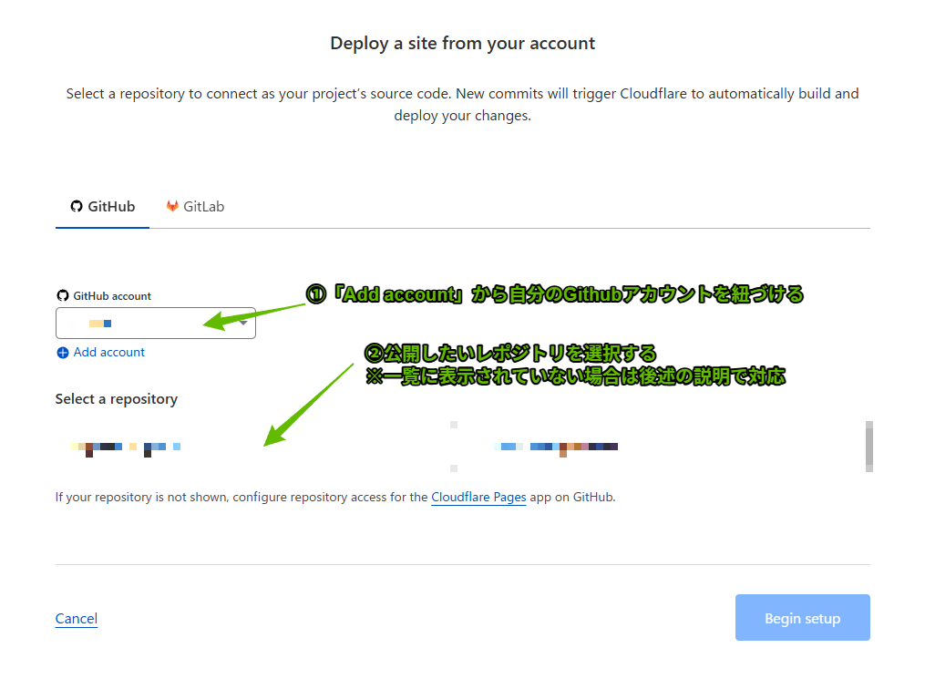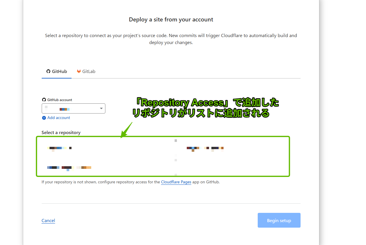 - このGitHub側の設定が完了したら、Cloudflare Pagesの画面に戻り、リポジトリ選択のリストを更新(またはページを再読み込み)すると、先ほどアクセスを許可したプライベートリポジトリが表示されるはずです。目的のリポジトリを選択し、「セットアップを開始」ボタンをクリックして次のステップに進みます。