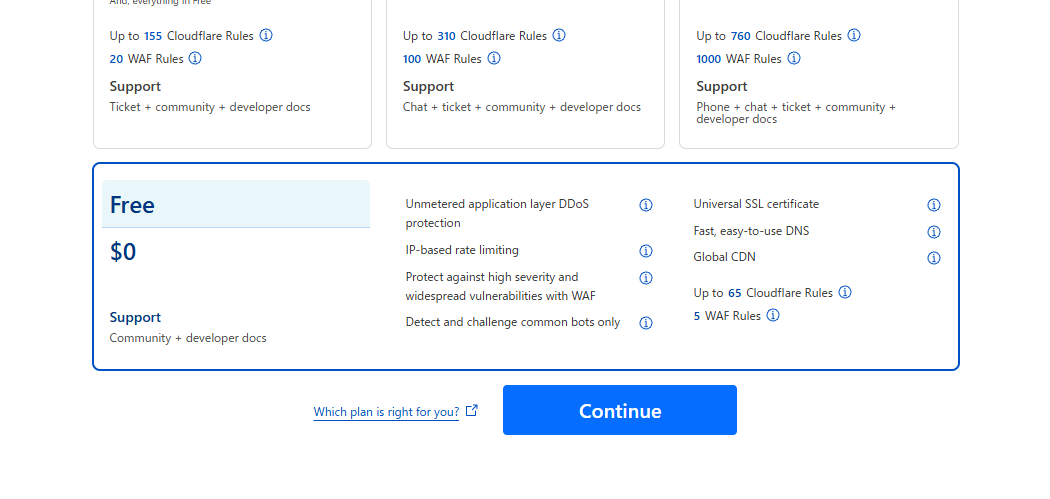 - Cloudflareのプラン選択画面が表示されます。独自ドメインの利用だけであれば、通常は画面下部にある「Freeプラン」(無料プラン)を選択して「Continue」をクリックすれば十分です。