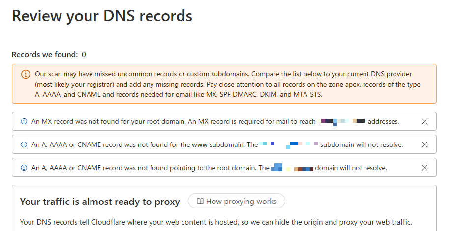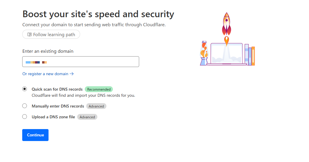 - ドメイン名を入力し、Cloudflareが既存のDNSレコードをスキャンするプロセスに進みます。「Continue」をクリックします。