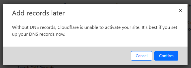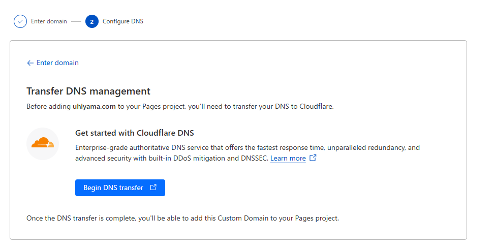 - もしまだそのドメインがCloudflareで管理されていない場合は、CloudflareにドメインのDNS管理を移管(または部分的に委任)するプロセスが開始されます。画面の指示に従い、「DNS転送を開始」や「サイトを追加」のようなボタンをクリックします。(※これはドメイン自体をCloudflareに移管するのではなく、あくまでDNSの管理権限をCloudflareに向ける設定です)