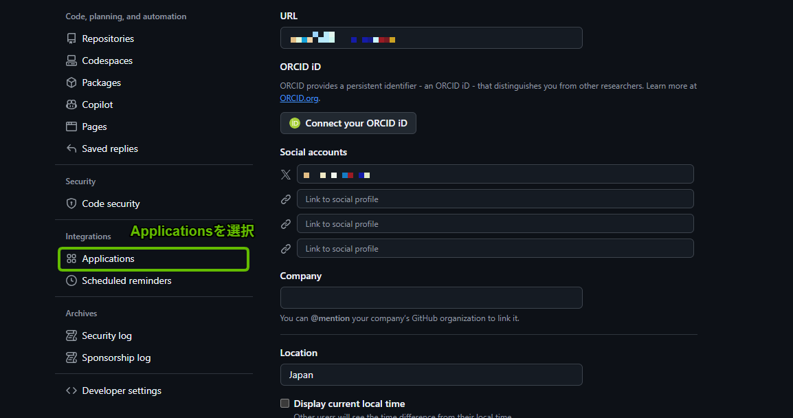 - GitHubにログインし、右上のアイコンから「Settings」(設定)を開き、左側メニューの「Applications」(アプリケーション)を選択します。