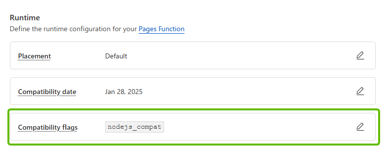 プロジェクトの「設定」>「関数」>「互換性フラグ」セクション(または「互換性設定」など類似の項目)を見つけます。「フラグを設定」(または「追加」)ボタンをクリックし、「nodejs_compat」というフラグを追加して保存します。(通常、実稼働環境とプレビュー環境の両方に設定します)