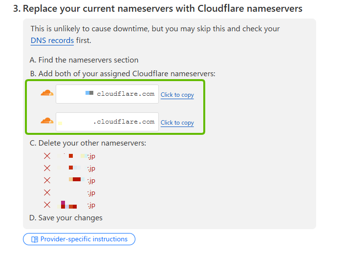 - 【重要】 この画面で、あなたのドメインに設定すべき**Cloudflareのネームサーバーアドレス(通常は2つ)**が表示されます。これらのアドレス(例: