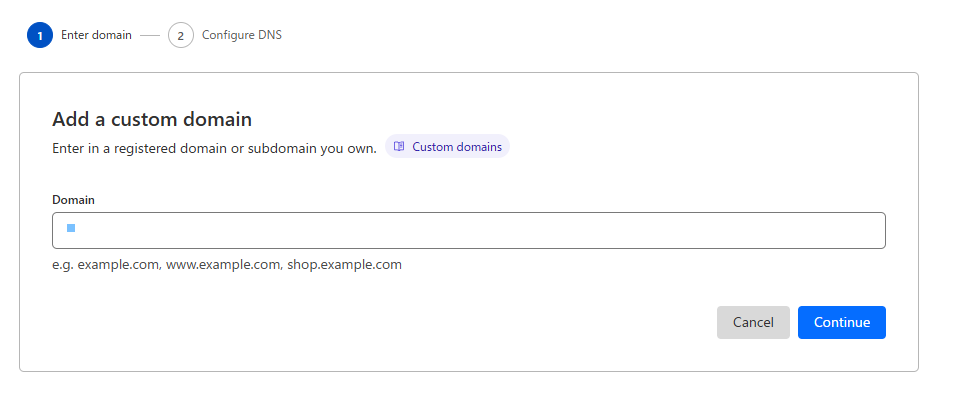 「カスタムドメインを設定」ボタンをクリックし、もう一度あなたの独自ドメイン名を入力して「続行」します。