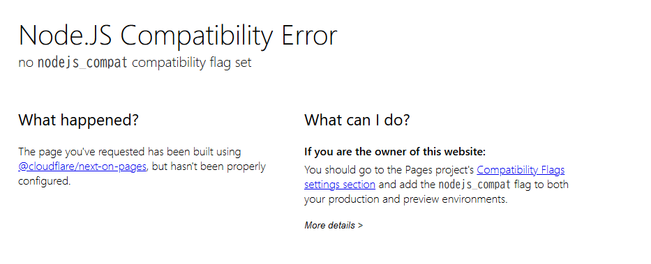 これは「Node.JS Compatibility Error」と呼ばれるもので、Cloudflare Pagesの実行環境(Cloudflare Workers)でNext.jsアプリケーション(特にサーバーサイドの機能やAPIルートなど)を正しく動作させるために、Node.jsのAPI互換モードを有効にする必要があることを示しています。