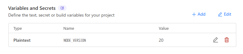 NODE_VERSION - 値: あなたのNext.jsプロジェクトが必要とするNode.jsのバージョン番号を指定します(例: