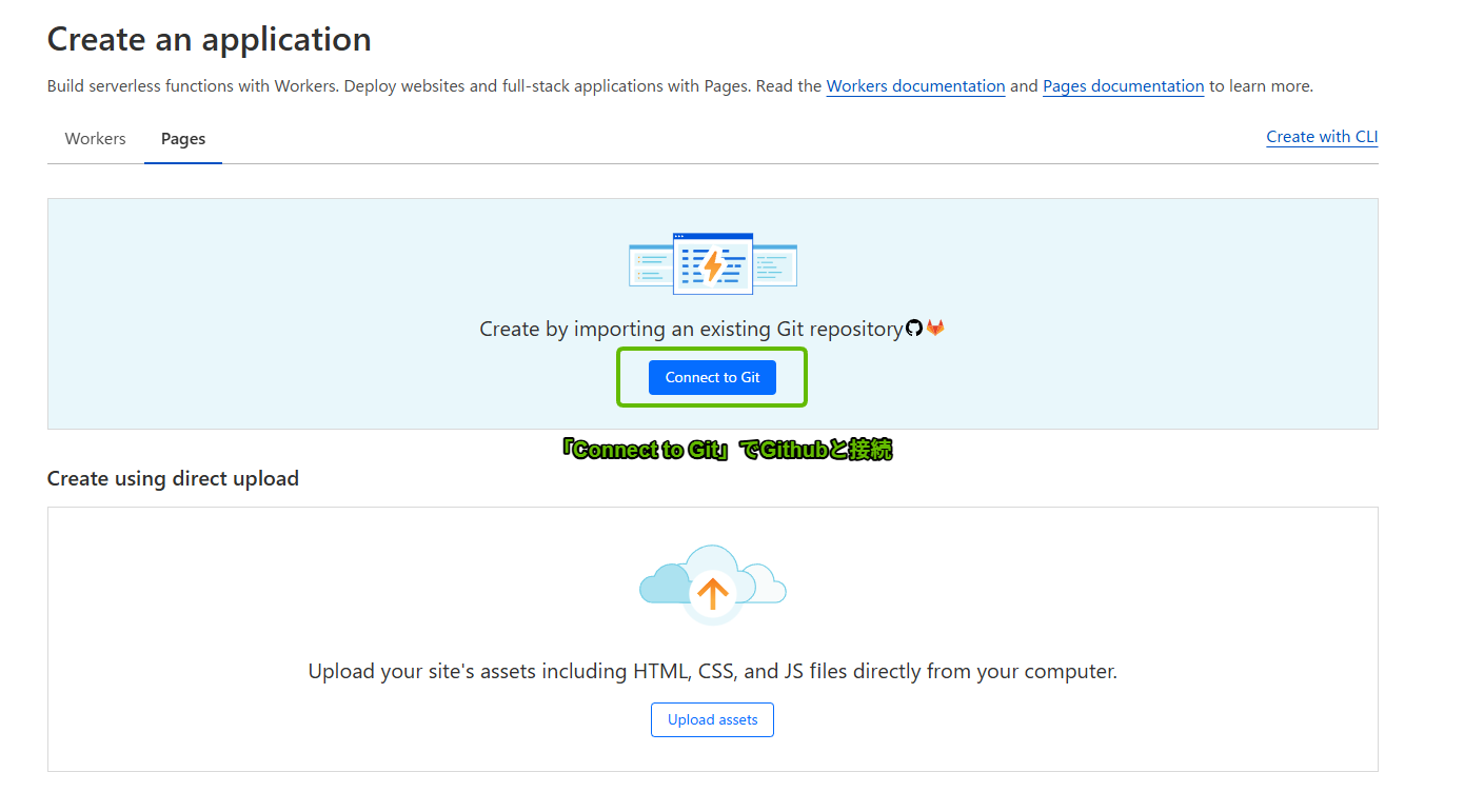 - 「アプリケーションを作成」画面が開いたら、「Pages」タブが選択されていることを確認し、「Gitに接続」ボタンをクリックします。Cloudflare PagesはGitリポジトリと連携して自動デプロイを行うのが基本です。