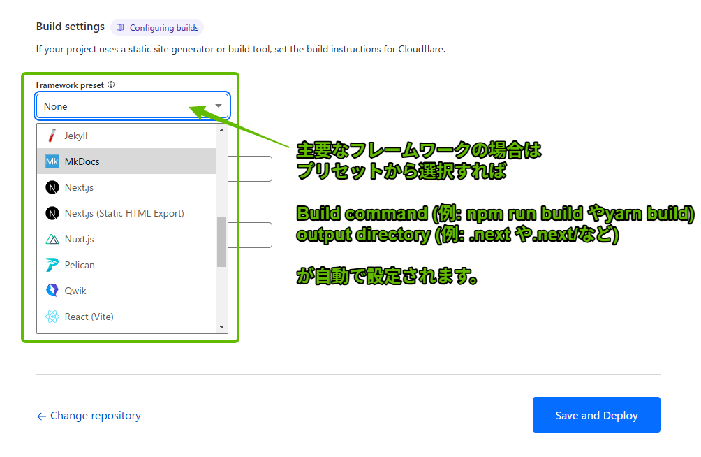リポジトリを選択すると、次にビルド設定とデプロイに関する設定画面が表示されます。Cloudflare PagesがGitHubリポジトリからコードを取得し、どのようにビルドしてデプロイするかをここで指定します。