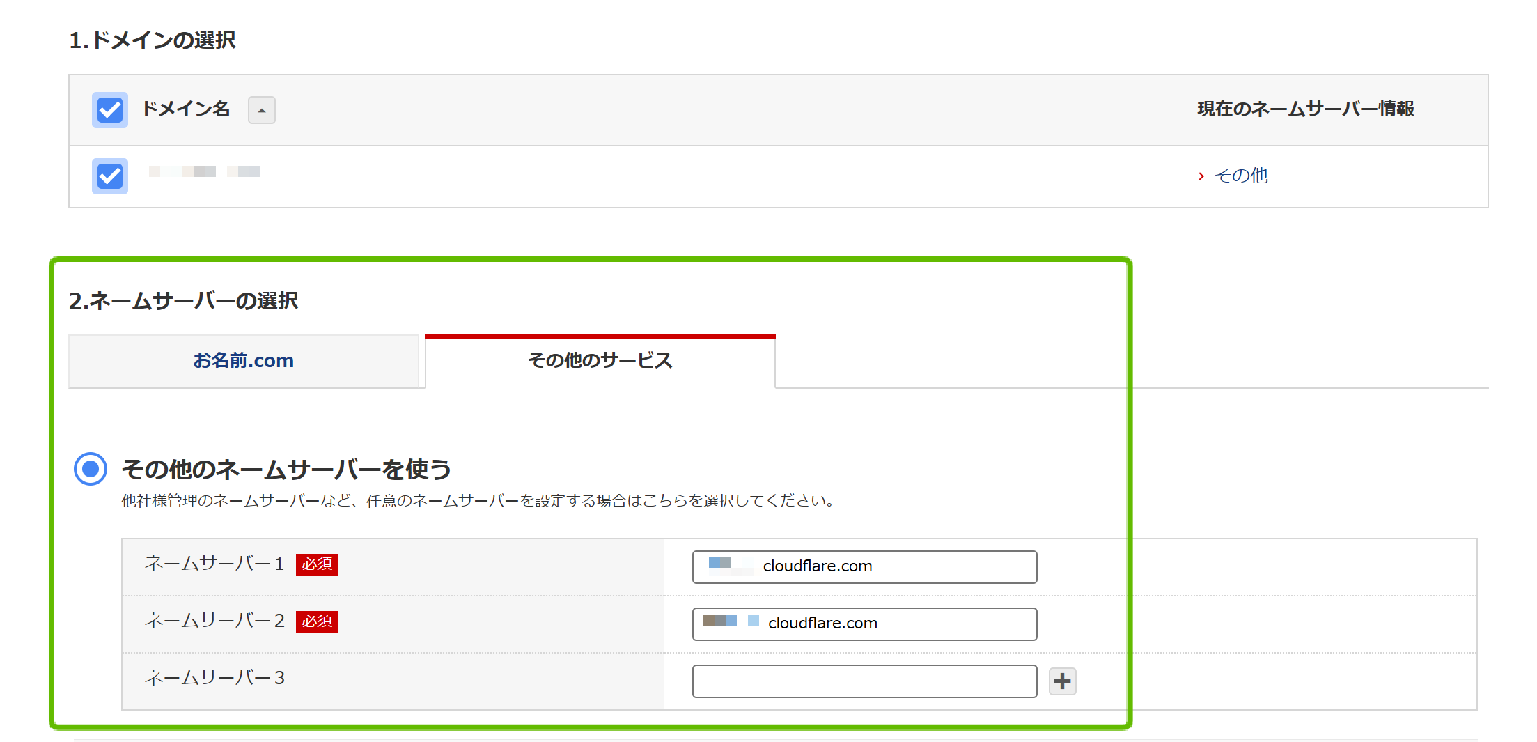 レジストラの現在のネームサーバー設定(通常はレジストラ自身のネームサーバーが設定されています)を削除または変更し、先ほどCloudflareから指示された2つのネームサーバーアドレスを入力・保存します。(入力欄が複数ある場合は、指示された2つを入力し、残りは空欄にするか、レジストラの指示に従います)