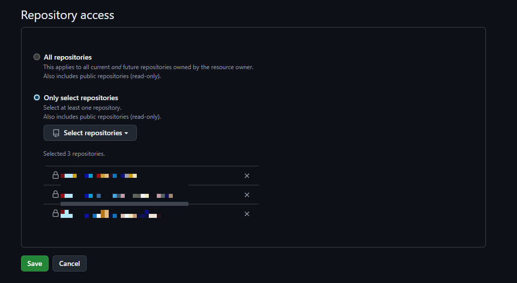 - 「Repository access」(リポジトリへのアクセス)セクションまでスクロールします。ここで、「Only select repositories」(選択したリポジトリのみ)オプションを選択し、表示されるリポジトリリストの中から、Cloudflare PagesにデプロイしたいNext.jsプロジェクトのリポジトリにチェックを入れます。最後に「Save」ボタンを押して変更を保存します。